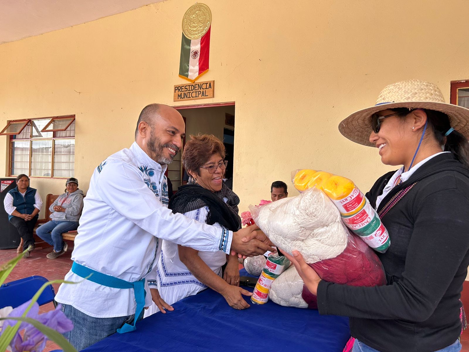 Por ello y en respuesta a esta petición, se hizo entrega de paquetes de hilos en cuatro diferentes colores a las mujeres que aún conservan las técnicas del tejido tradicional de las fajas de Tlacotepec, esto como un primer apoyo y acercamiento con las artesanas.