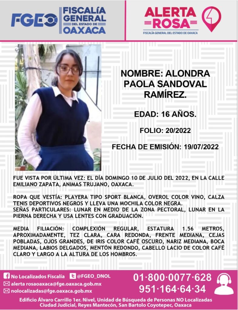 ALERTA ROSA de la adolescente ALONDRA PAOLA SANDOVAL RAMÍREZ.