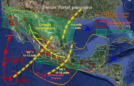 Línea de convergencia se extiende desde el Noroeste hasta el Centro del país, es reforzado por un fuerte campo de divergencia en altura así como la entrada de humedad proveniente del Océano Pacífico, favoreciendo el desarrollo de nublados convectivos y lluvias de moderadas a fuertes con tormentas eléctricas en los estados del Noroeste, Occidente, Centro y Sur del Territorio Nacional. Posible ciclón tropical en el Océano Pacífico se ubica al Sur de Michoacán y Colima, su circulación favorece la entrada de humedad hacia el interior de los estados del Pacífico Sur y Occidente del país donde se prevén lluvias moderadas a fuertes. Vaguada invertida en nivel medio de la atmosfera, se extiende desde el posible ciclón tropical ubicado al Sur de Michoacán hasta el Oriente del país, continua ocasionando lluvias moderadas a fuertes sobre los estados del Sureste, Centro y Oriente de la República Mexicana.