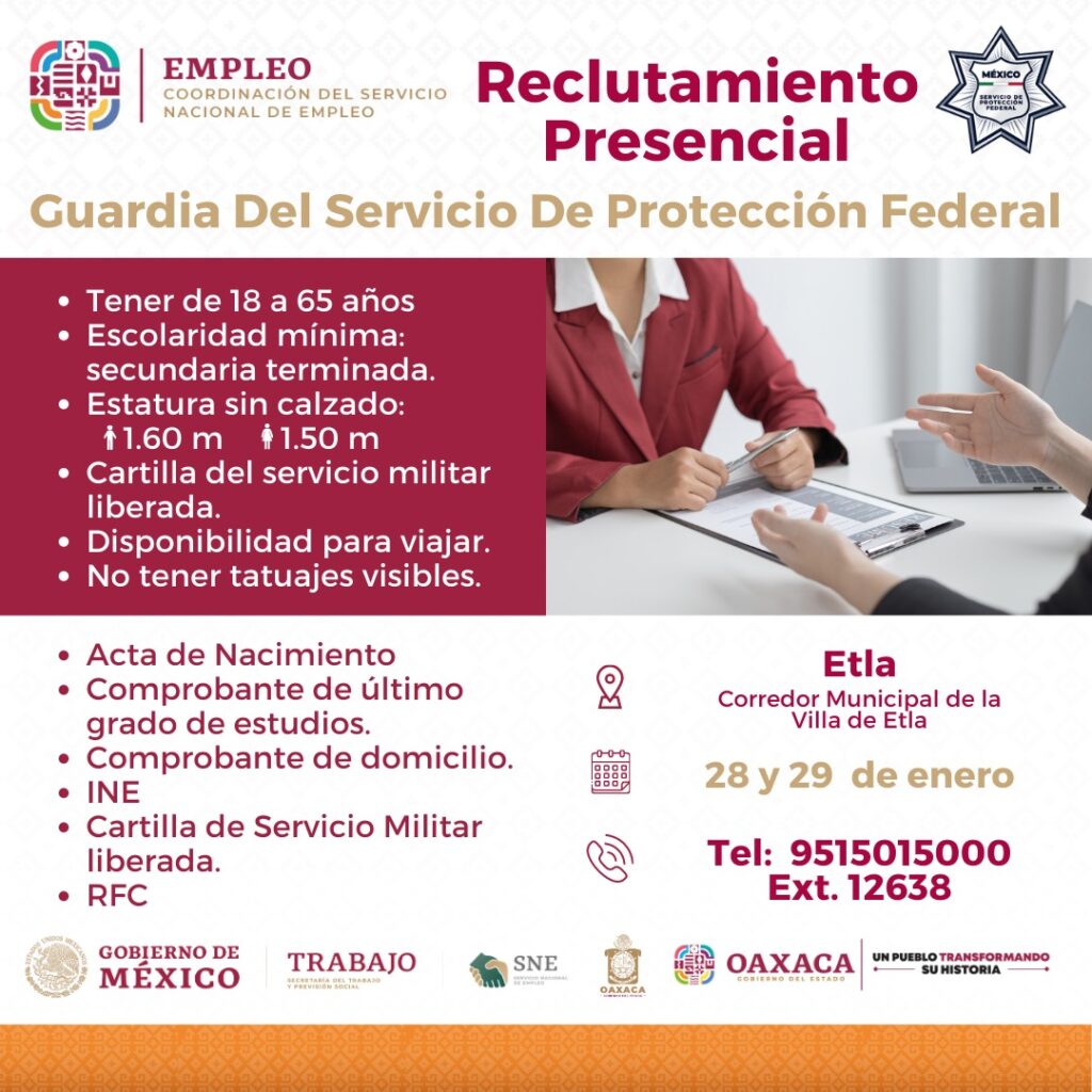 Oaxaca de Juárez, Oax. 27 de enero de 2023. El Gobierno del Estado a través de la Coordinación del Servicio Nacional de Empleo, convoca a las y los oaxaqueños de entre 18 y 65 años de edad, a formar parte de la Guardia del Servicio de Protección Federal.