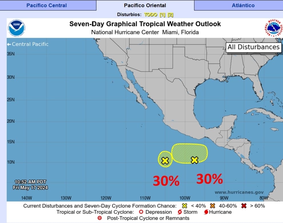 La Coordinación Estatal de Protección Civil y Gestión de Riesgos (CEPCyGR) informa que se continúa el monitoreo de una zona de inestabilidad atmosférica localizada al sur de las costas de Guerrero y Oaxaca, la cual presenta una disminución de 10 por ciento de desarrollo ciclónico a siete días.