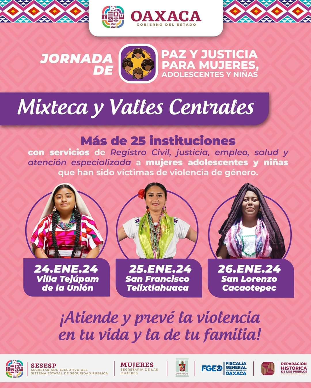 Oaxaca de Juárez, Oax. 22 de enero de 2024.- En seguimiento a las acciones interinstitucionales para erradicar la violencia de género en las ocho regiones de la entidad, el Secretariado Ejecutivo del Sistema Estatal de Seguridad Pública (SESESP) llevará la Jornada de Paz y Justicia para Mujeres, Adolescentes y Niñas a la Mixteca y Valles Centrales.