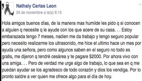 Nathaly Cartas de León, de 20 años, tenía ocho meses de embarazo y estaba desesperada por obtener un empleo o ayuda económica para juntar los 2 mil pesos con lo que cubriría los gastos de su parto en Reynosa, Tamaulipas. La joven publicó en Facebook su situación en aquel diciembre de 2014.
