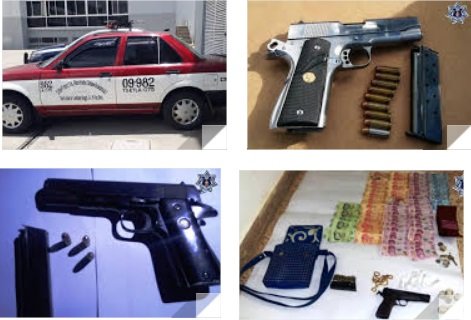 En otra intervención, la Base de Operaciones Mixtas (BOM) integrada por efectivos de la Policía Estatal y del Ejército Mexicano, dio a conocer que al cabo de las 01:40 horas, en la calle Querétaro, colonia Odilón Mina de Loma Bonita, fue localizada una camioneta volcada, marca Hyundai Creta, color azul, con placas de circulación YCC090A de México y número de serie MB2C32AC2JM397456, misma que al ser inspeccionada se ubicó en su interior un arma corta de marca ilegible, calibre 9 mm, matrícula 32858, con su respetivo cargador y 13 cartuchos útiles, así como la cantidad de 10 mil pesos en efectivo.