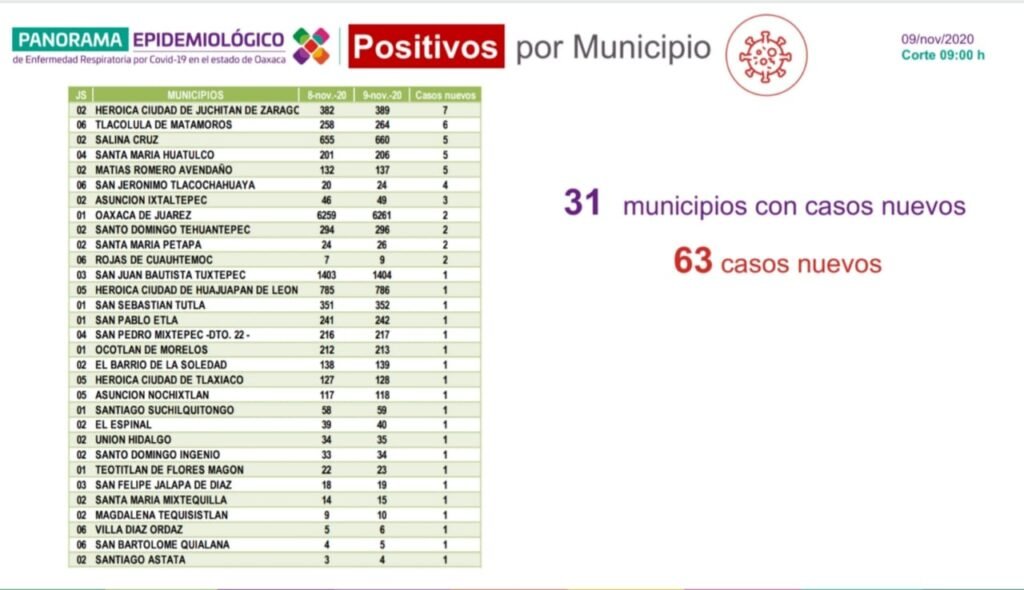 Sostuvo que los 63 casos nuevos se distribuyen en 31 municipios de la entidad, siendo los que mayor número de casos presentan, Juchitán de Zaragoza con siete, Tlacolula de Matamoros seis, Salina Cruz, Santa María Huatulco, y Matías Romero Avendaño cinco cada uno, San Jerónimo Tlacochahuaya cuatro, Asunción Ixtaltepec tres, el resto dos y uno.