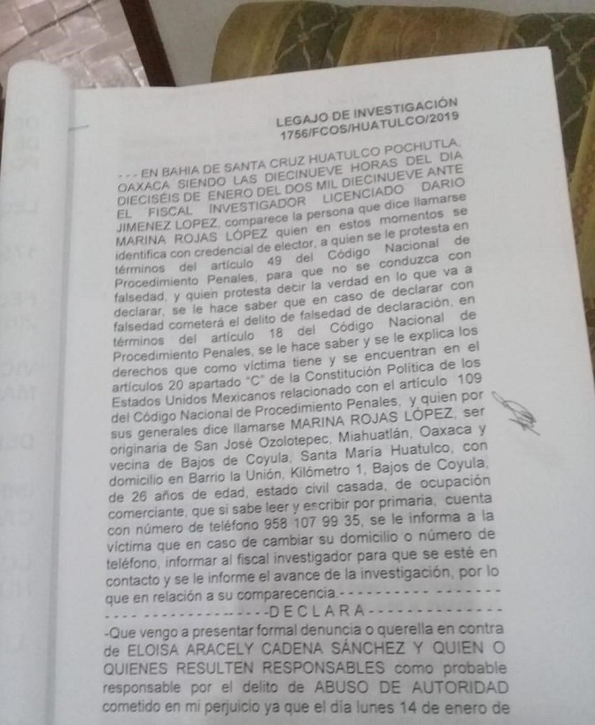 La pareja de Marina Rojas López y Manuel Cartas Pérez, denunció ante la fiscalía que el pasado lunes por la noche llego a ver a su mama de Marina, a lado del parque de arena de la crucecita, Huatulco, cuando al llegar vieron que dos personas se besaban y al acercarse se dieron cuenta que era dos policías una de ella era Aracely; al pasar Marina le dio las buenas noches por educación, pero no contestaron porque se besaban y no podían hablar.