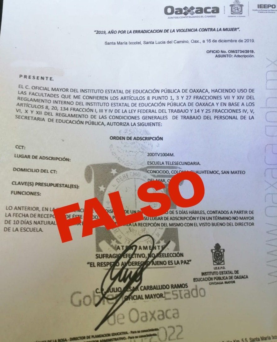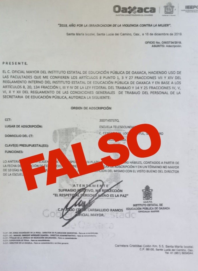Oaxaca de Juárez, Oax. 12 de enero de 2020. Ante las falsas órdenes de adscripción o presentación para la incorporación de docentes al sistema educativo o el cambio de centros de trabajo, lo que ha resultado un fraude, el Instituto Estatal de Educación Pública de Oaxaca (IEEPO), atiende oportunamente las observaciones detectadas por los Directores y Supervisores que han recibido a personal supuestamente contratado por esta institución.