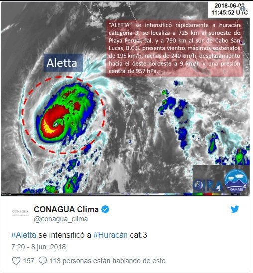 El Servicio Meteorológico Nacional (SMN) informó este viernes que la tormenta tropical Aletta pasó rápidamente de huracán categoría 1 en la escala Saffir-Simpson a categoría 4 esta mañana, localizándose al suroeste de las costas de Jalisco y Colima.