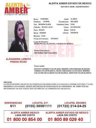 Ciudad de México, 8 de noviembre (SinEmbargo).- Hace más de una semana que se vio por última vez a Alexandra Lizbeth Pineda Rivas de 16 años de edad. El 30 de octubre, la joven estudiante del Estado de México regresó de la escuela abordo del camión que la llevaba a su casa, bajó del vehículo y desapareció.