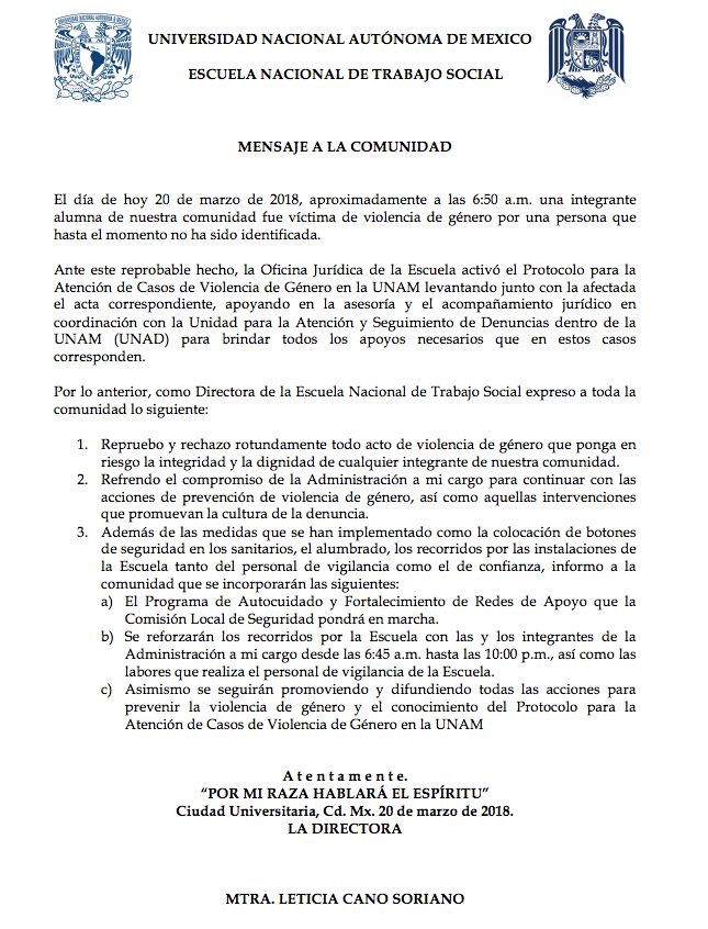 El ataque fue confirmado por la dirección de la ENTS en un comunicado, donde se informó sobre la activación del “Protocolo para la Atención de Casos de Violencia de Género de la UNAM”, así como el reforzamiento de recorridos de vigilancia por la escuela de las 6:45 a las 22 hrs.