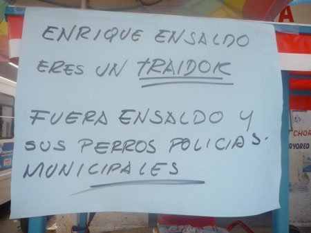 “Los ladrones están en el palacio municipal, soy vendedor ambulante pero honrado”, “Ensaldo Fuera nos discriminas porque somos pobres”, “Yo no tengo sueldo de regidor necesito trabajar porque soy pobre, Ensaldo muera por traidor”, “Fuera ratas del municipio los ambulantes te repudian, fuera policías municipales”, señalaban algunas de las cartulinas en alusión a la política de trabajo que viene implementando el presidente de este lugar.