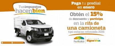 tercera edición de la Campaña “Tus impuestos hacen bien”, que en enero ofrece el 15 por ciento de descuento en el pago del Predial y la oportunidad de participar en el sorteo de una camioneta con valor de 208 mil pesos.