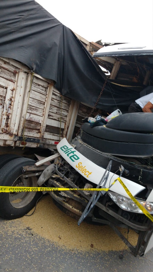 Jalisco .-El percance ocurrió sobre el kilómetro 04 de la autopista Tepic- Guadalajara, por donde circulaba un camión Mercedes Benz de la empresa Elite con el número económico 1055, cuando el operador se estrelló en la parte trasera de un carguero que transportaba varias toneladas de maíz.