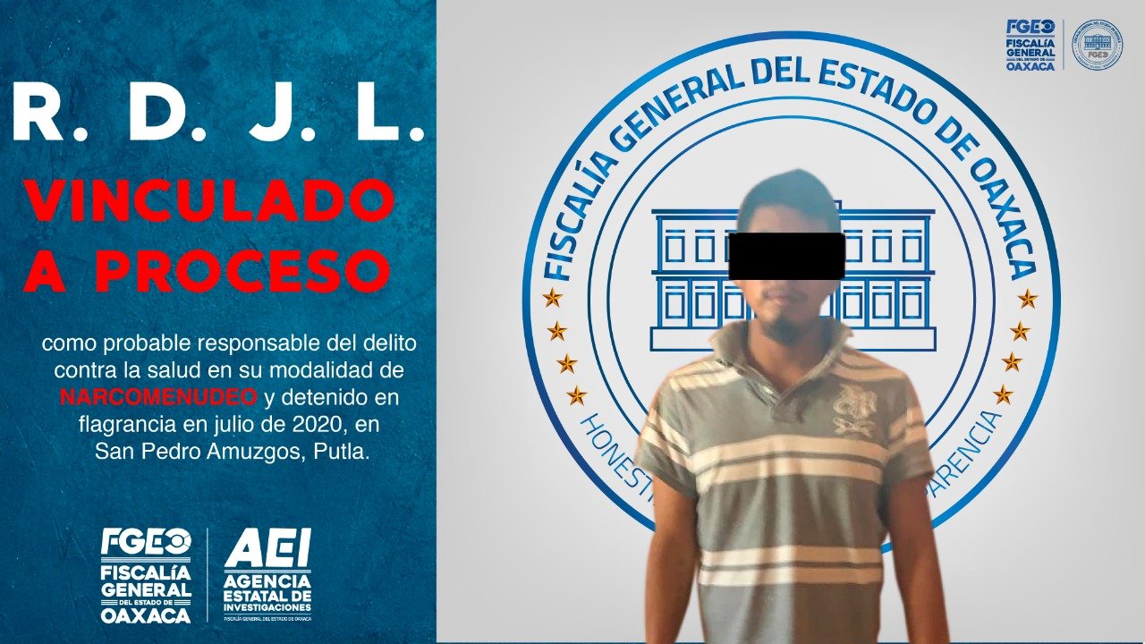 Oaxaca de Juárez, Oax., 22 de julio de 2020.- La Fiscalía General del Estado de Oaxaca (FGEO), detuvo y logró vincular a proceso a un masculino identificado R. D. J. L., señalado como probable responsable de la comisión del delito contra la salud en su modalidad de narcomenudeo, que operaba en el municipio de San Pedro Amuzgos, Distrito de Putla.