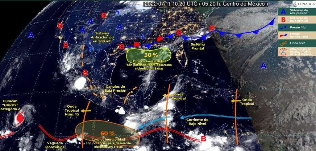 Oaxaca de Juárez, Oax. 11 de julio de 2022. Para este inicio de semana, la Coordinación Estatal de Protección Civil de Oaxaca (CEPCO) dio a conocer que se esperan lluvias con tormentas aisladas sobre el oriente y norte del Istmo de Tehuantepec, así como en la Cuenca del Papaloapan por la aproximación de una nueva onda tropical que estará interactuando con un canal de baja presión sobre la Sonda de Campeche.