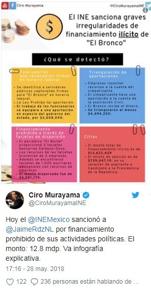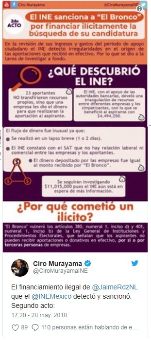 El Instituto Nacional Electoral (INE) impuso una sanción por 739 mil pesos contra Jaime Rodríguez Calderón, “El Bronco”, al detectar que utilizó un esquema de financiamiento ilegal por 12 millones 800 mil pesos.
