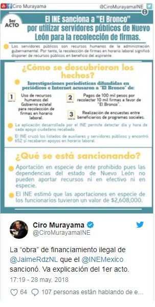 El Consejero Electoral del Instituto Nacional Electoral también dijo que se dio una “simulación de haber recibido recursos legítimos de ciudadanos en la cuenta bancaria de la asociación civil “Viva la Independencia”. En el caso de 23 personas, un día o dos antes de hacer la transferencia bancaria a la asociación civil del Bronco habían recibido las mismas cantidades, por parte de empresas mercantiles.