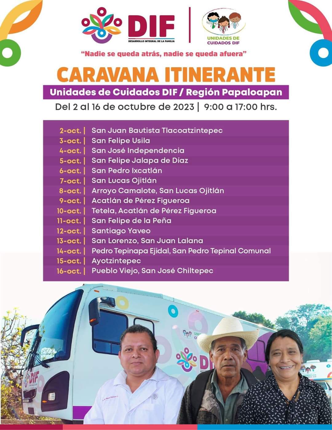 Este martes 10 de octubre estará en la comunidad Tetela perteneciente a Acatlán de Pérez Figueroa, el 11 en San Felipe de La Peña, el 12 de octubre en Santiago Yaveo y el 13 de octubre en San Lorenzo, San Juan Lalana.
