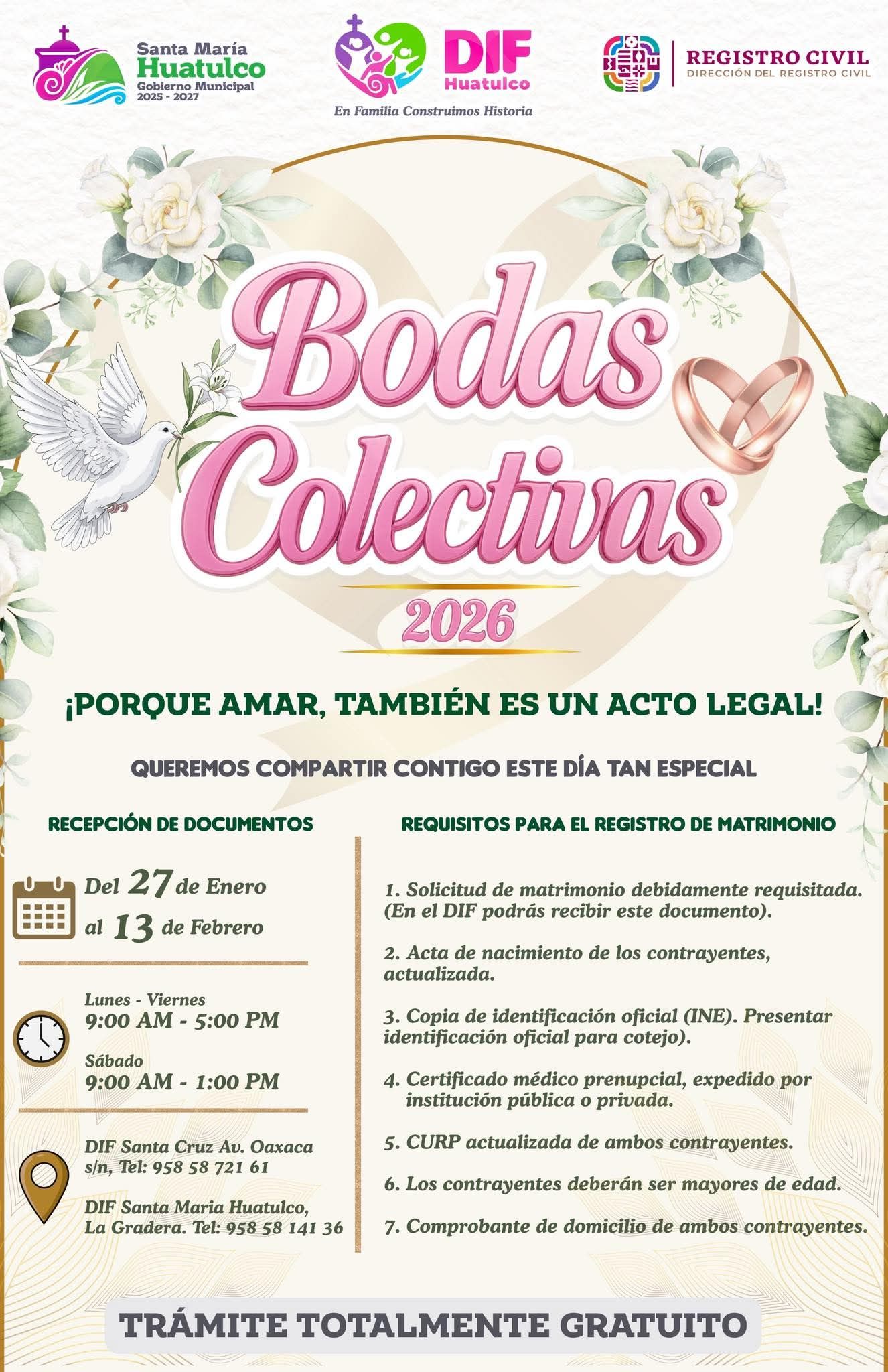 Este trámite es totalmente gratuito, pensado para que más parejas puedan dar este importante paso, compartir su historia y construir un futuro con bases firmes.