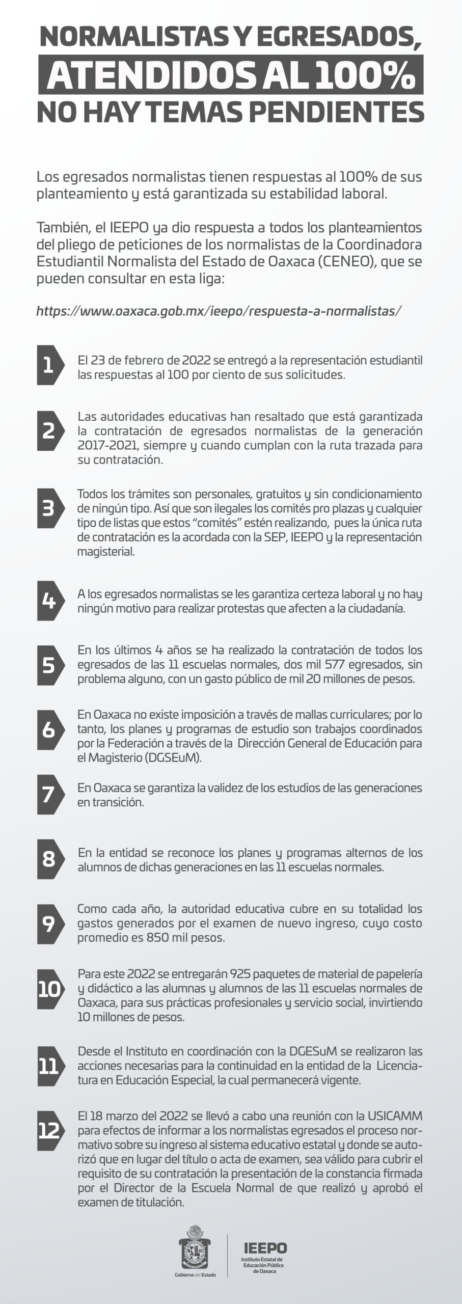 Asimismo, la autoridad educativa dio respuesta al pliego de peticiones de la Coordinadora Estudiantil Normalista del Estado de Oaxaca (CENEO) que se encuentra disponible para su consulta en el enlace: https://www.oaxaca.gob.mx/ieepo/respuesta-a-normalistas/, en el ejercicio de transparencia, honradez y rendición de cuentas en que se rige el Instituto.