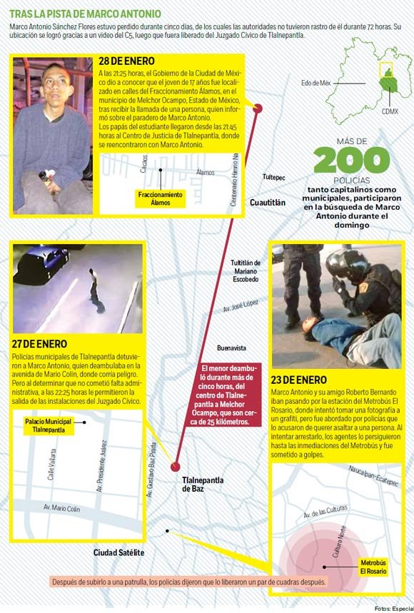Sin embargo fue hasta las 22:15 horas del sábado 27 de enero, cuando un sujeto, con las características de Marco fue puesto a disposición del juzgado calificador en Tlalnepantla, debido a que lo observaron en actitud sospechosa deambulando por las calles de Mario Colín donde corría peligro, pero al no haber ningún argumento para su detención fue liberado a las 22:25 y salió por su propio pie con rumbo nuevamente a Mario Colín, dijo el mandatario capitalino. Esta información se les presentó a los padres en el video.