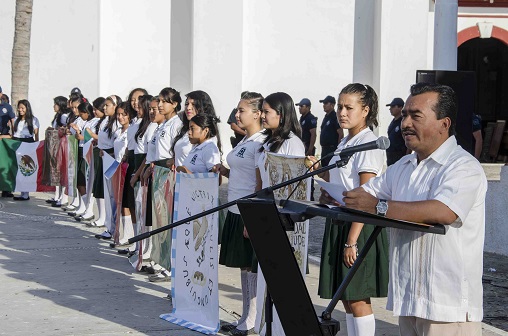 Acompañado de la Presidenta Honoraria del Sistema DIF Municipal, María de la Luz Díaz Ruiz, de los regidores, y de alumnos de la Secundaria General José Vasconcelos, la Secundaria Técnica #61 y el CECyTEO plantel 38, el primer concejal rindió honores a la enseña tricolor en la explanada del Palacio Municipal, donde habló de la importancia de conmemorar este día.