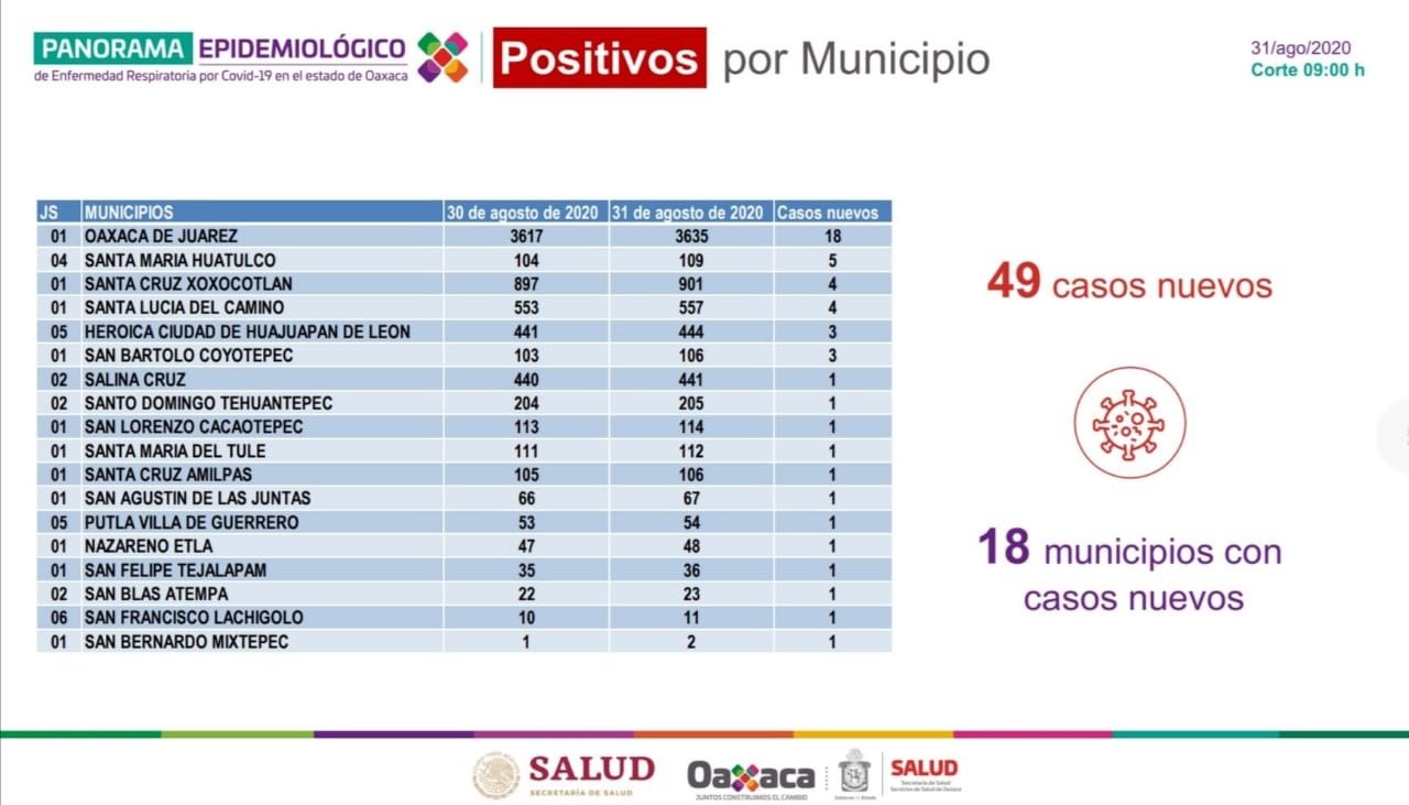 Agregó que en el informe epidemiológico de este día, se detectaron 18 municipios con nuevos casos: 10 en Oaxaca de Juárez, cinco en Santa María Huatulco, cuatro en Santa Cruz Xoxocotlán y mismo número en Santa Lucía del Camino, además de tres en Heroica Ciudad de Huajuapan de León y San Bartolo Coyotepec, el resto de ayuntamientos un caso cada uno.