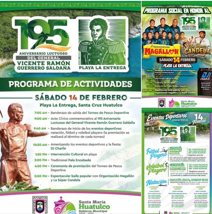 Este sábado 14 de febrero, el Gobierno Municipal de Santa María Huatulco, que preside el Ing. Julio Cárdenas invita a la ciudadanía y visitantes a participar en la conmemoración del 195 Aniversario Luctuoso del General #Vicente Ramón Guerrero Saldaña, héroe de nuestra historia nacional, en Playa #LaEntrega Santa Cruz #Huatulco.