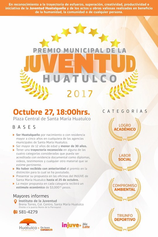 Abren convocatoria del Premio Municipal de La Juventud 2017Abren convocatoria del Premio Municipal de La Juventud 2017Octubre 11 de 2017.- El Gobierno Municipal de Santa María Huatulco, que preside José Hernández Cárdenas, a través del Instituto de la Juventud Municipal, presentó en conferencia de prensa en el auditorio de la Agencia de Santa Cruz Huatulco, las bases del Premio Municipal de la Juventud 2017.