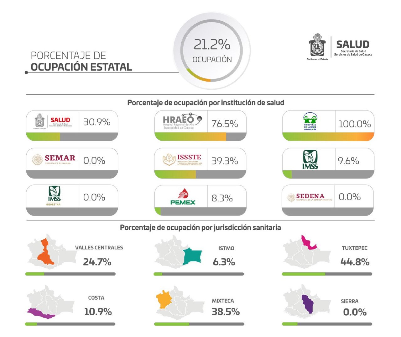 Hay 813 casos activos distribuidos en 114 municipios y una defunción; Oaxaca al 21.2% de disponibilidad hospitalaria