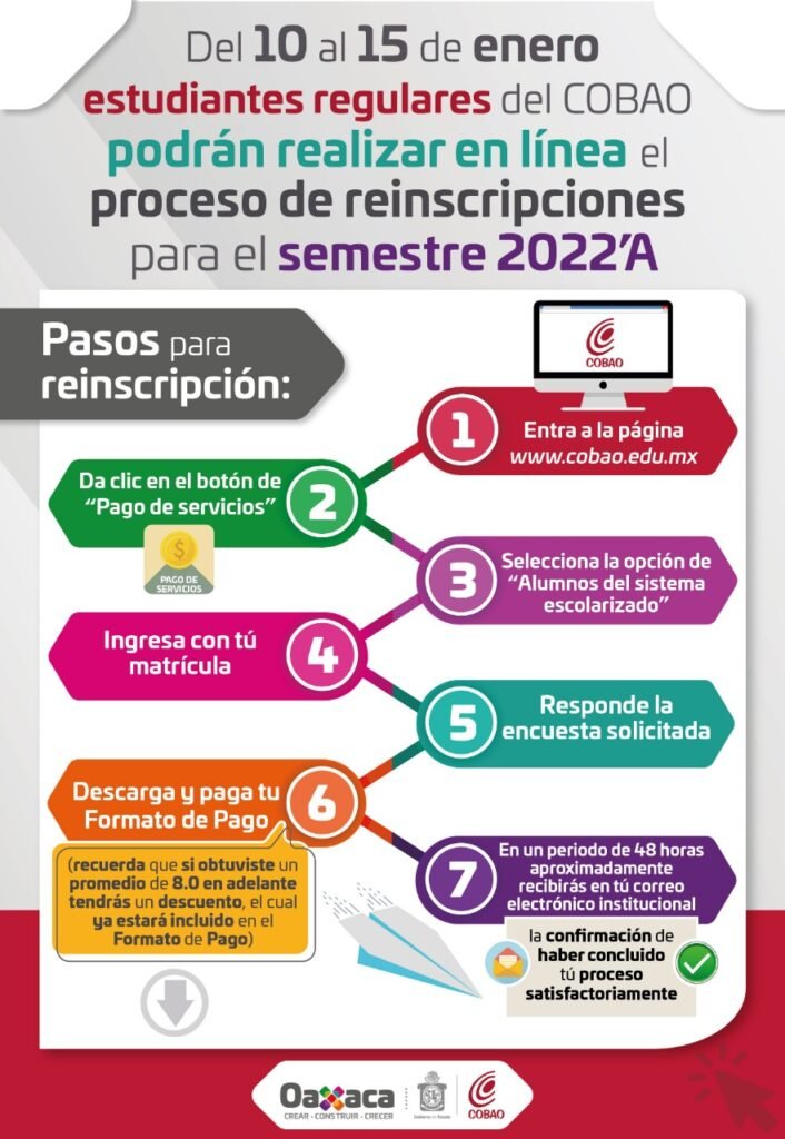 Santa Cruz Xoxocotlán, Oax. 7 de enero de 2022.- Del 10 al 15 de enero, estudiantes regulares del Colegio de Bachilleres del Estado de Oaxaca (Cobao) podrán realizar en línea el proceso de reinscripciones para el semestre 2022´A.