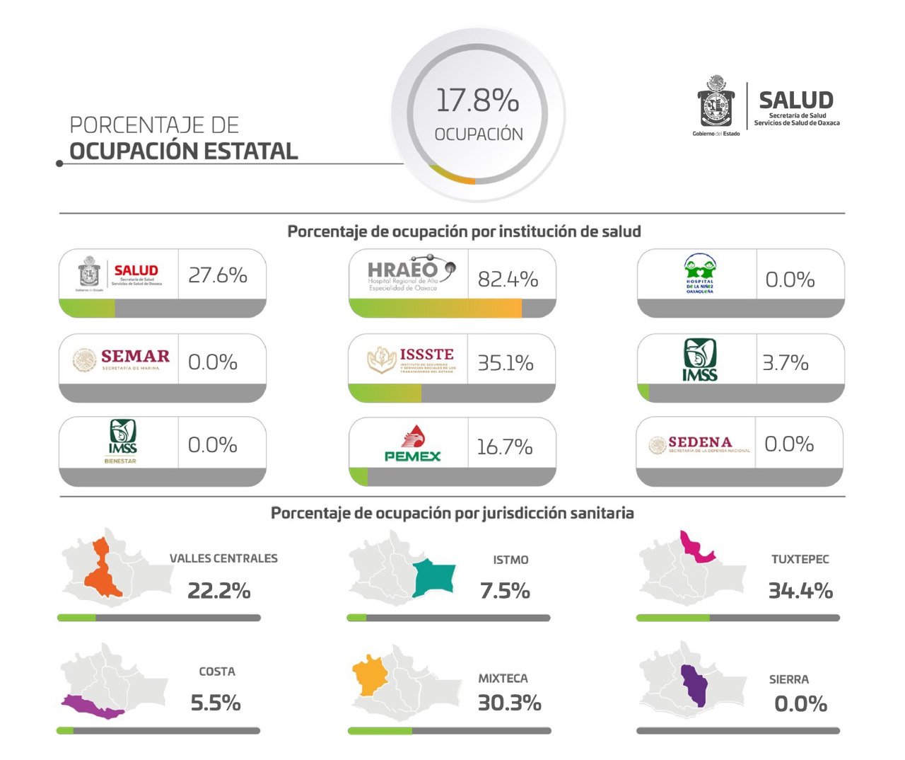 Para esta jornada se registró el ingreso hospitalario de dos personas, para un total de 70 que se encuentran recibiendo atención dentro de una Unidad Médica, por lo cual Oaxaca cuenta con una disponibilidad de 323 camas de un global de 393, así también el número de nosocomios que reportaron el 100% de ocupación es de cinco.