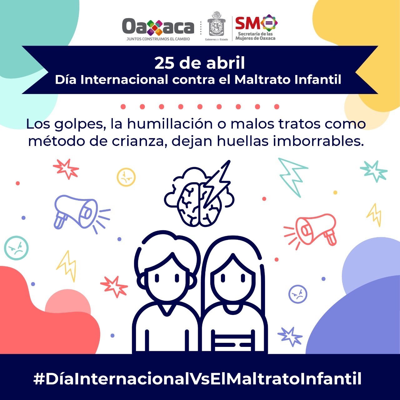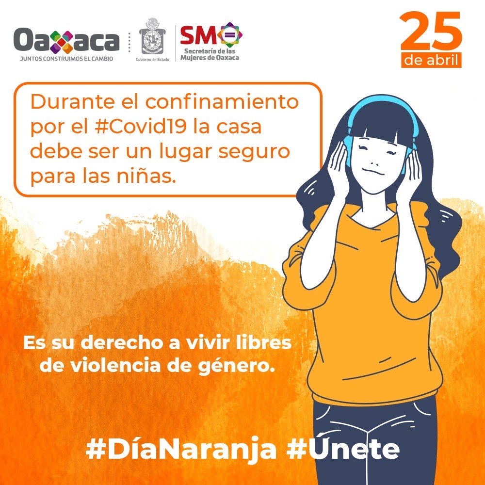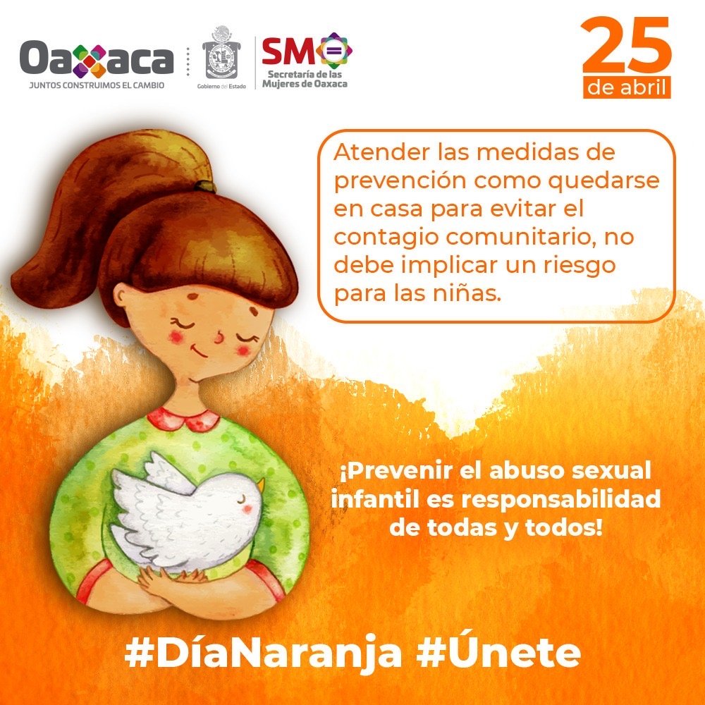 Oaxaca de Juárez, Oax. 25 de abril de 2020.- En el marco del Día Naranja y del Día Internacional de la lucha contra el Maltrato Infantil, la Secretaría de las Mujeres de Oaxaca (SMO) reitera su llamado a la sociedad a impedir que el confinamiento por COVID-19 propicie abusos, desatención, negligencia o daño a la salud física y mental, o al desarrollo y dignidad de niñas, niños y adolescentes.