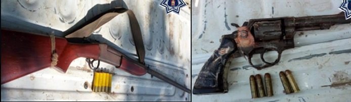 Dámaso J. M. y Ronaldo R. J., de 20 y 19 años de edad, respectivamente, fueron detenidos por efectivos de la Policía Estatal, debido a que en la unidad de motor en la que viajaban fueron localizadas dos armas de fuego para la que no presentaron las licencias de portación correspondiente.