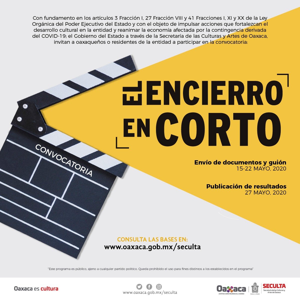 Oaxaca de Juárez, Oax. 11 de mayo de 2020. Para impulsar acciones que fortalezcan el desarrollo cultural en la entidad y reactivar la economía afectada por la contingencia derivada del COVID-19, el Gobierno del Estado, a través de la Secretaría de las Culturas y Artes de Oaxaca (Seculta), invita a las y los oaxaqueños o personas residentes en la entidad a participar en la convocatoria “El encierro en corto”.