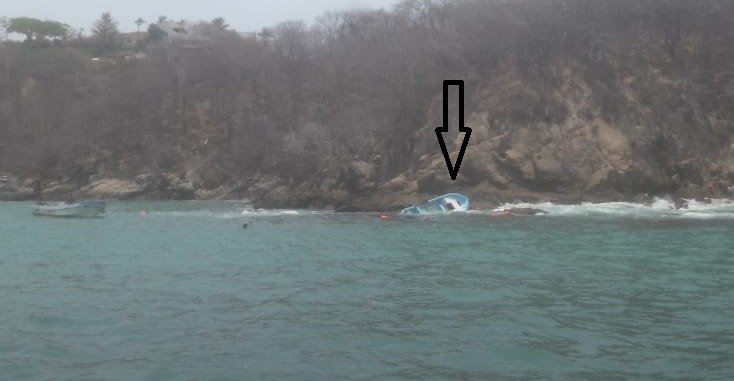 Bahías de Huatulco. – Ocho turistas naufragaron en Huatulco, después de ir navegando en una embarcación turística cuando una de las olas del efecto mar de fondo los sorprendió y los pantoqueo (volvo) y la embarcación tipo IMENSA se partió en dos parte.