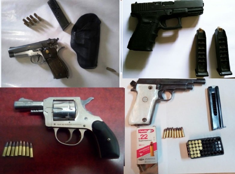 En el sitio fueron detenidos José E. L., de 42 años de edad, y Rosalino G. V., de 44, mismos que no contaban con la licencia correspondiente para la portación legal de dos armas de fuego tipo pistola, calibre 380, cuatro cargadores metálicos y 28 cartuchos útiles del mismo calibre.