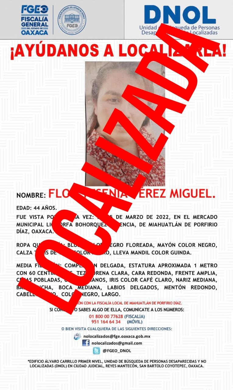Personal de la DNOL logró localizar a la mujer identificada como Flor Yesenia Pérez Miguel, cuyo reporte de no localización había sido realizado el pasado mes de marzo del año en curso, fecha en la que fue vista por última vez en inmediaciones del mercado municipal “Lic. Orfa Bohórquez Valencia” de Miahuatlán de Porfirio Díaz, en la región de la Sierra Sur.