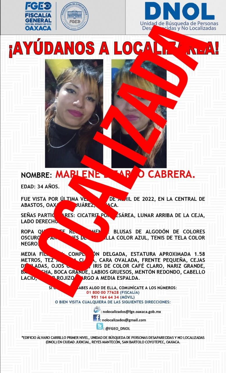 Asimismo, las labores Institucionales de búsqueda permitieron la localización de la ciudadana Marlene Bizarro Cabrera, quien había sido vista por última vez el pasado 14 de abril del año en curso en la Central de Abastos de la Ciudad de Oaxaca de Juárez, en la región de Valles Centrales.
