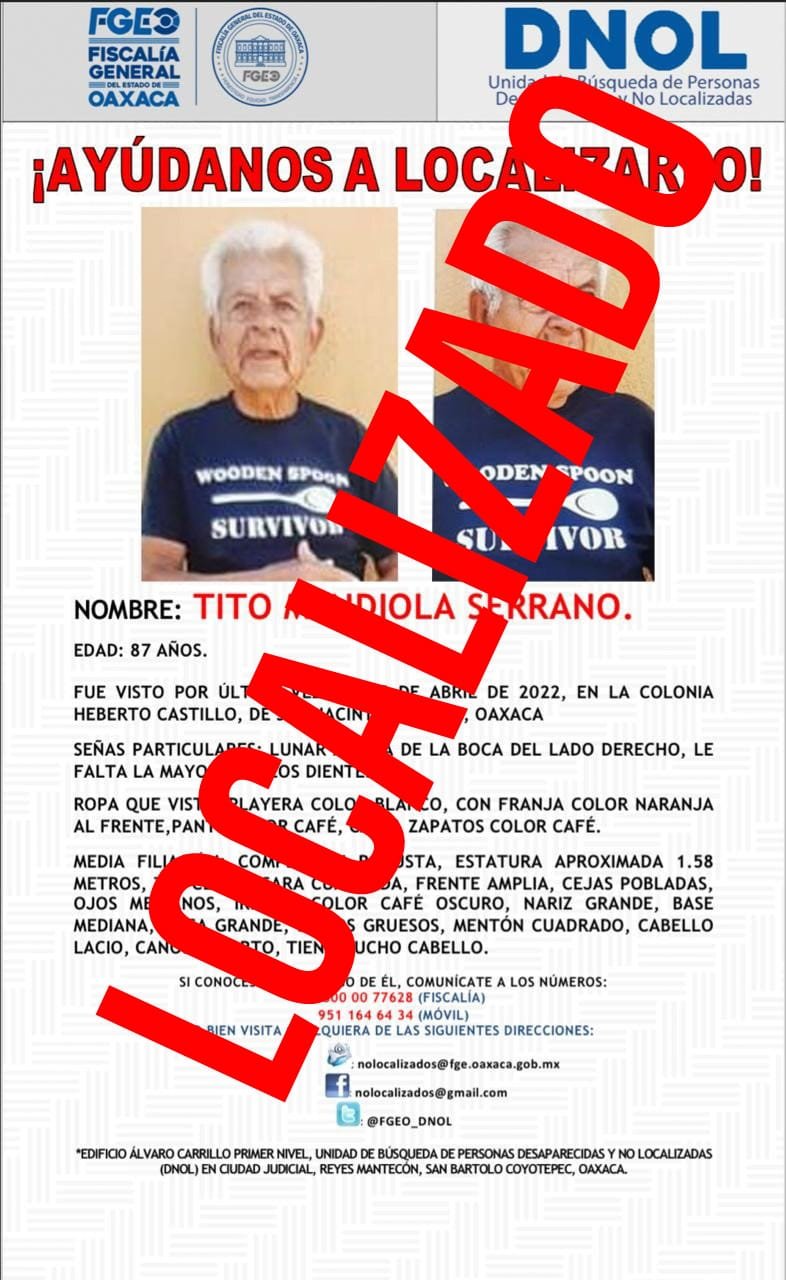 En atención a otro caso, se ubicó y restituyó con su familia al adulto mayor identificado como Tito Mendiola Serrano, quien había sido vista por última vez el 15 de abril en la colonia Heberto Castillo, jurisdicción de San Jacinto Amilpas.