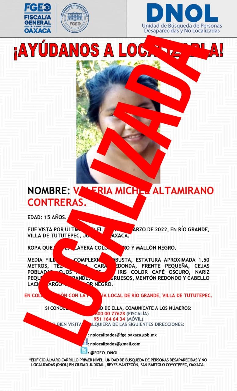 Respecto al caso asentado en la carpeta de investigación 13256/FCOS/DNOL/2022, iniciada por el delito de desaparición de persona, la Fiscalía General logró localizar a la adolescente Valeria Michel Altamirano Contreras.