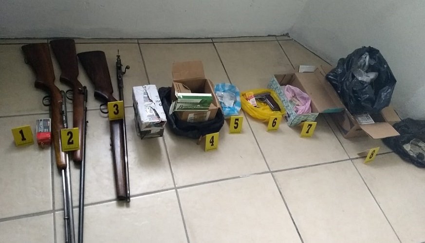 Durante el cateo se aseguró 1 arma corta calibre .22 y 3 armas largas calibre .22, 100 cartuchos calibre .12; 50 cartuchos calibre .380; 146 cartuchos calibre .20; 35 cartuchos calibre .16; 52 cartuchos calibre .410., y 168 cartuchos calibre .22.