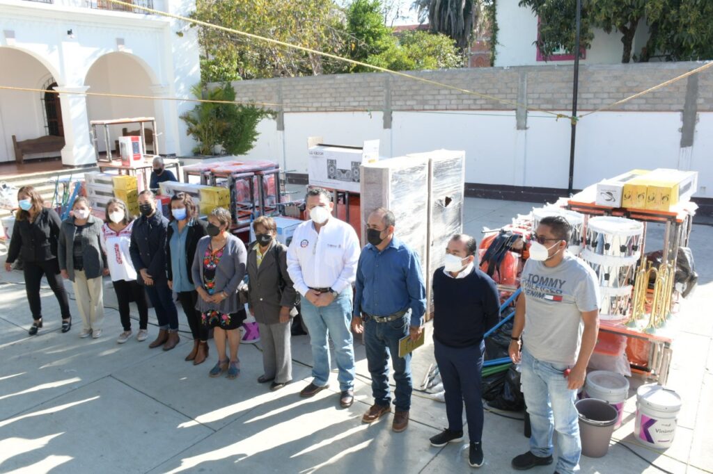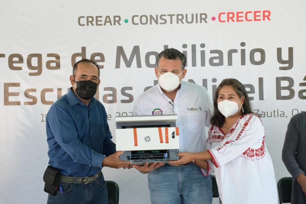 Lo anterior, beneficia a 348 estudiantes y 18 docentes de esa zona de los Valles Centrales, al respecto, el encargado de Despacho del IEEPO, Ernesto López Montero, acompañado del presidente municipal del lugar, Juan Ángel Lázaro Montes, hizo entrega de los apoyos consistentes en mesas, sillas, pizarrones, bandas de guerra, ventiladores, impresoras, equipos de sonido, rollos de malla y material de aseo, deportivo y de oficina.