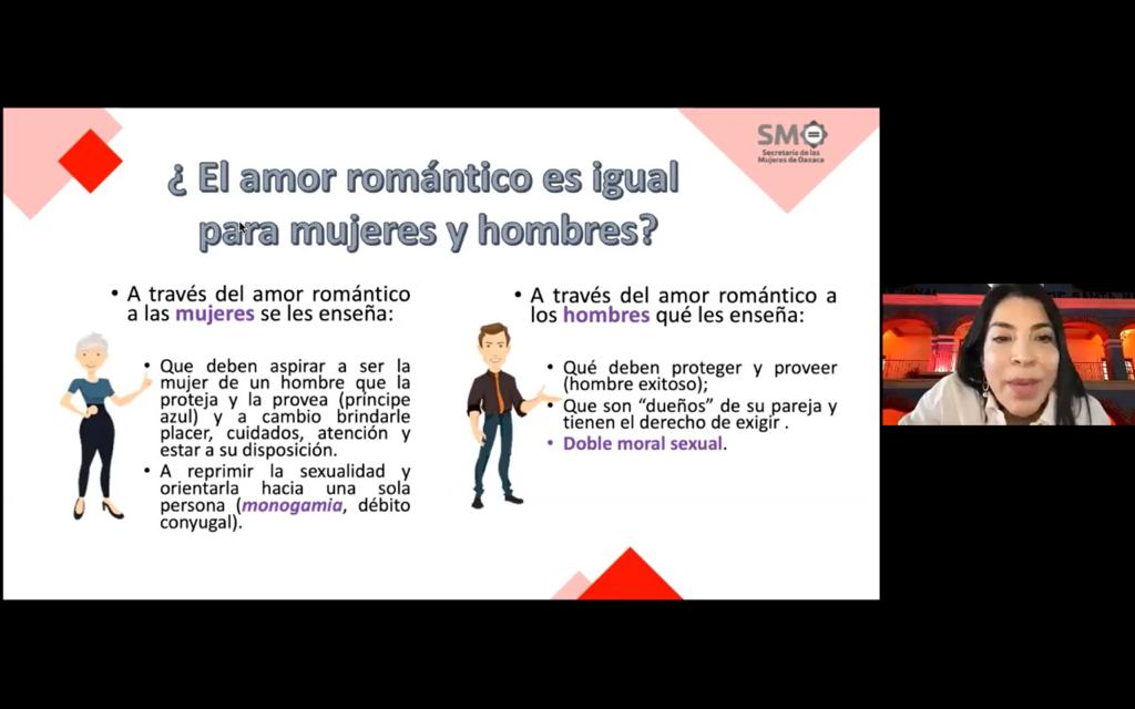 Oaxaca de Juárez, Oax., 17 de febrero de 2022.- Como parte de los procesos formativos permanentes a la población joven, la titular de la Secretaría de las Mujeres de Oaxaca (SMO) impartió el taller virtual titulado “Si duele, no es amor” a la comunidad estudiantil, donde casi 400 personas del Colegio de Bachilleres del Estado de Oaxaca (COBAO) Plantel 30 Güilá, conocieron y reflexionaron sobre los efectos negativos del amor romántico.