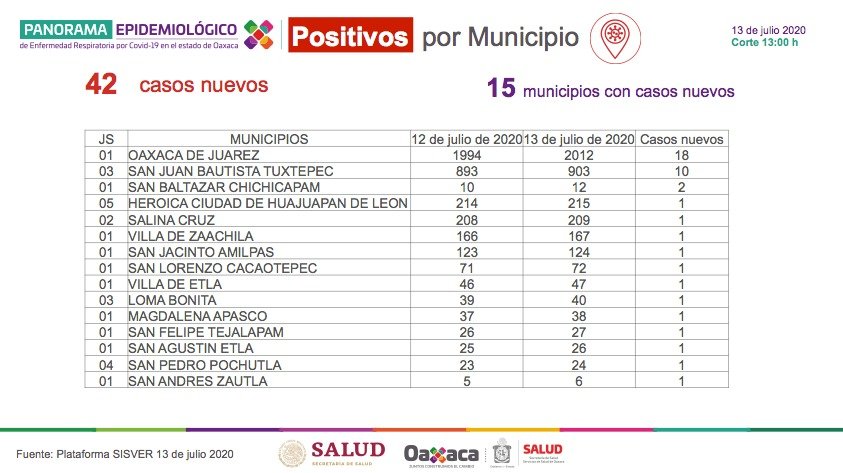 Dijo que los 42 casos nuevos se encuentran distribuidos en 15 municipios, siendo los principales que presentan el mayor número de contagios el de Oaxaca de Juárez con 18, San Juan Bautista Tuxtepec 10, San Baltazar Chichicapam dos y el resto un solo caso respectivamente.