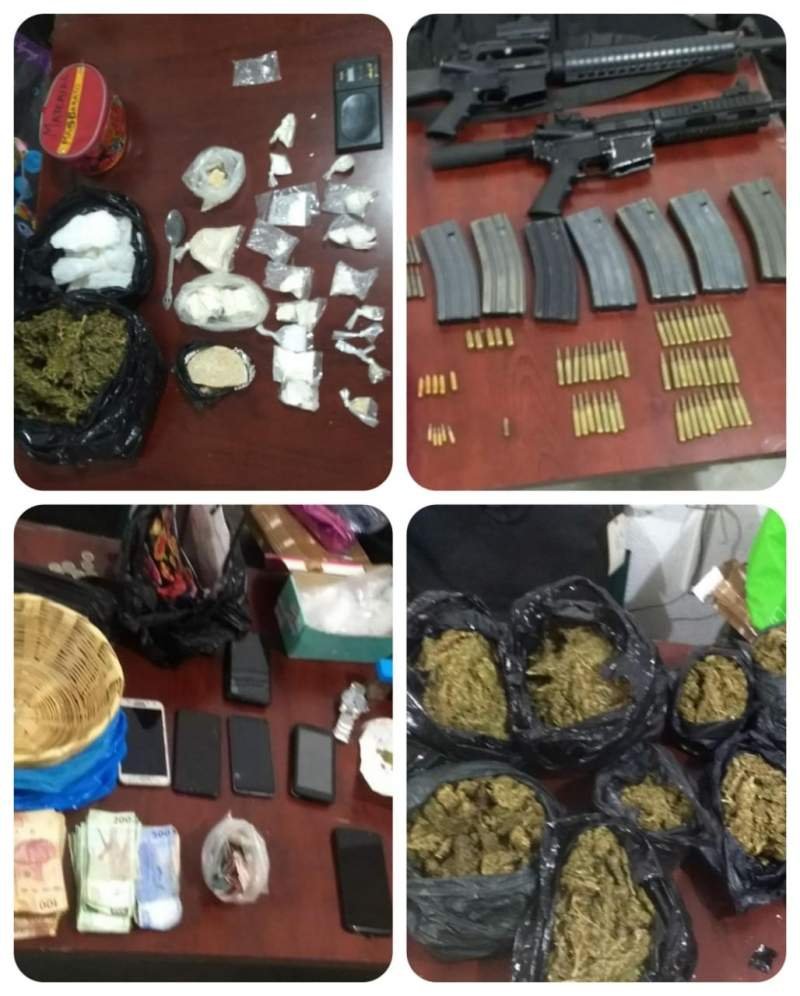 Como producto de este cateo, Agentes Estatales de Investigación aseguraron diversos envoltorios de nylon que contenían drogas como cocaína, cristal y de hierba verde con características de mariguana, así como armas de fuego, cartuchos de diferentes calibres y teléfonos celulares.