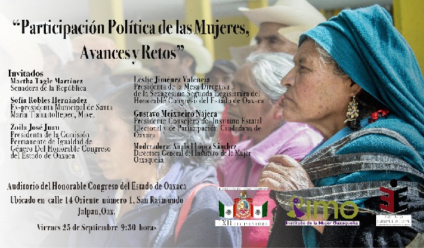 A fin de contribuir a la consolidación de compromisos institucionales que garanticen el efectivo acceso de los derechos de participación ciudadana de las mujeres, acordes con las reformas electorales, el Instituto de la Mujer Oaxaqueña (IMO), el H. Congreso del Estado de Oaxaca, a través de la Comisión Permanente de Igualdad de Género y el Instituto Electoral y de Participación Ciudadana de Oaxaca organizan el Foro “Participación Política de las Mujeres, Avances y Retos”.
