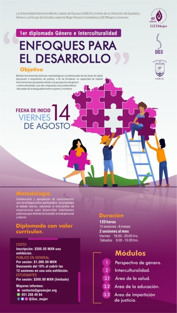 La fecha de inicio programada para este diplomado se establece para el viernes de agosto del presente año a las 16:00 horas; el valor curricular lo sustenta la Universidad Autónoma Benito Juárez de Oaxaca. Mayores informes a través del correo contacto@gesmujer.org o al número 9512084984.
