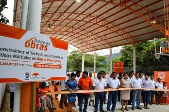 Gobierno de Huatulco inaugura techado en Paso AnchoSeptiembre 30 de 2017.- Para brindar lugares de esparcimiento adecuados para la sociedad, el Gobierno Municipal de Santa María Huatulco que preside José Hernández Cárdenas, inauguró la construcción del techado de la cancha de usos múltiples del Barrio Paso Ancho, en la Cabecera Municipal, beneficiando así a más de 600 vecinos del lugar y comunidades aledañas.