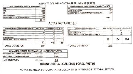 Queremos hacer publica la victoria respaldada por dichos documentos, teniendo una diferencia de 31 Votos a favor de la coalición Unidos por la Paz y el Progreso en el Municipio de San Pedro Pochutla.